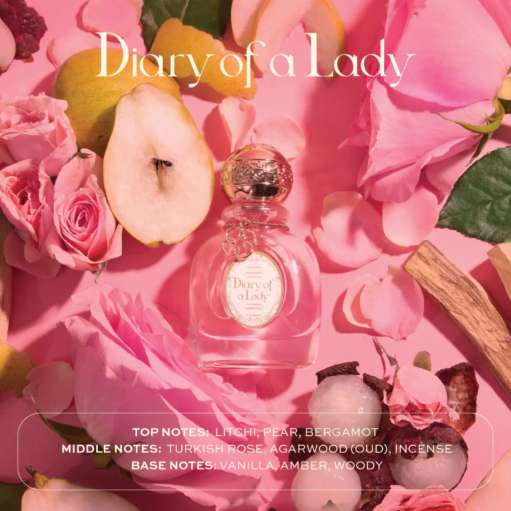 Lucky Beauty's Lucky Potion Diary of a Lady is a fragrance that weaves personal dreams into reality, beginning with fresh lychee, pear, and bergamot. It transitions to a heart of Turkish rose, oud, and incense, and finishes with a warm, comforting blend of amber, vanilla, and wood.