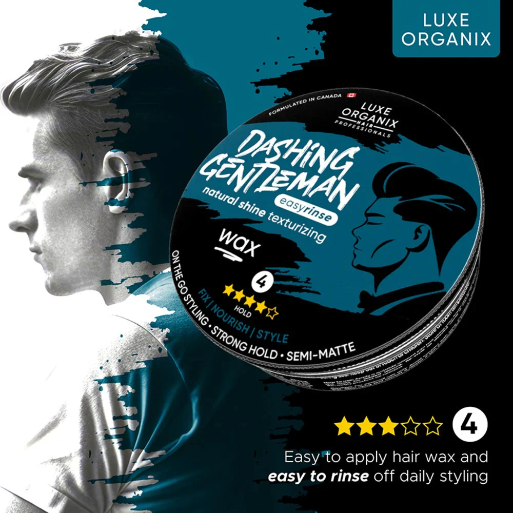 Luxe Organix Dashing Gentleman Natural Shine Texturizing Wax offers a strong yet flexible hold for versatile styling. It delivers a natural satin shine and is easy to apply and rinse off for daily use.