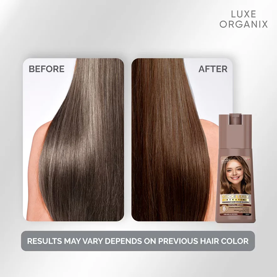 Achieve salon-quality hair color at home with Luxe Organix Quick & Easy Permanent Hair Color Shampoo in Natural Brown. This innovative, ammonia-free and peroxide-free formula delivers vibrant, natural-looking color in just 20 minutes.